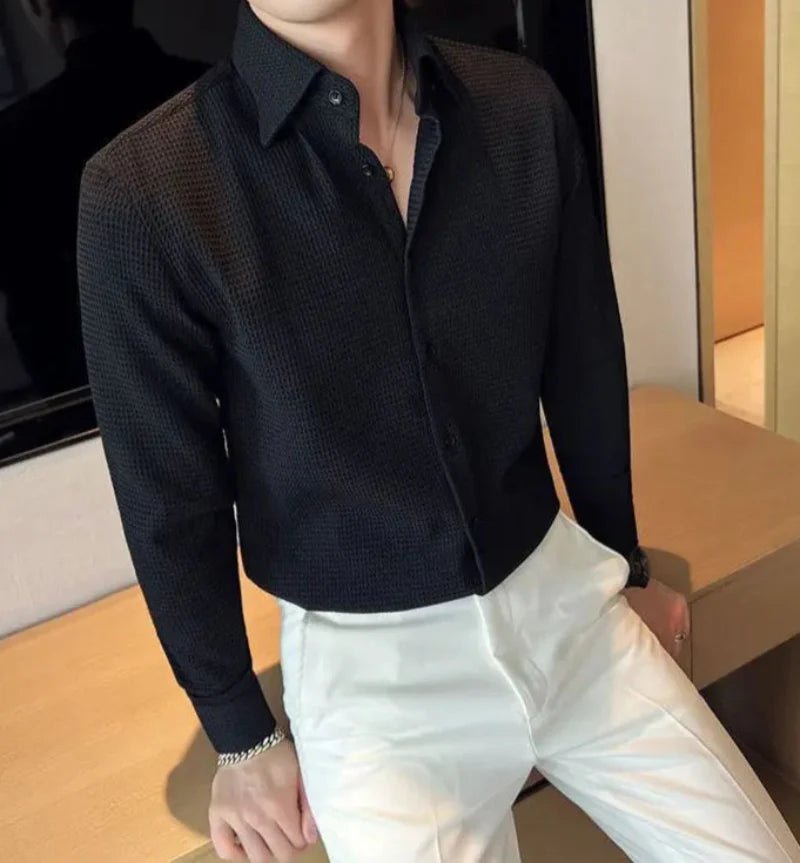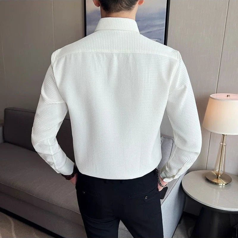 A modern take on the classic polo, featuring a textured waffle-knit fabric, a structured collar, and a slim fit for a sharp yet comfortable look.