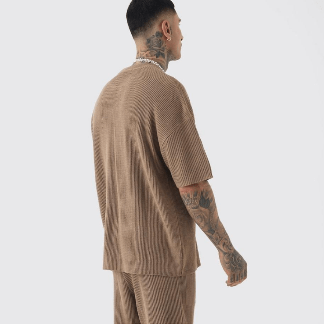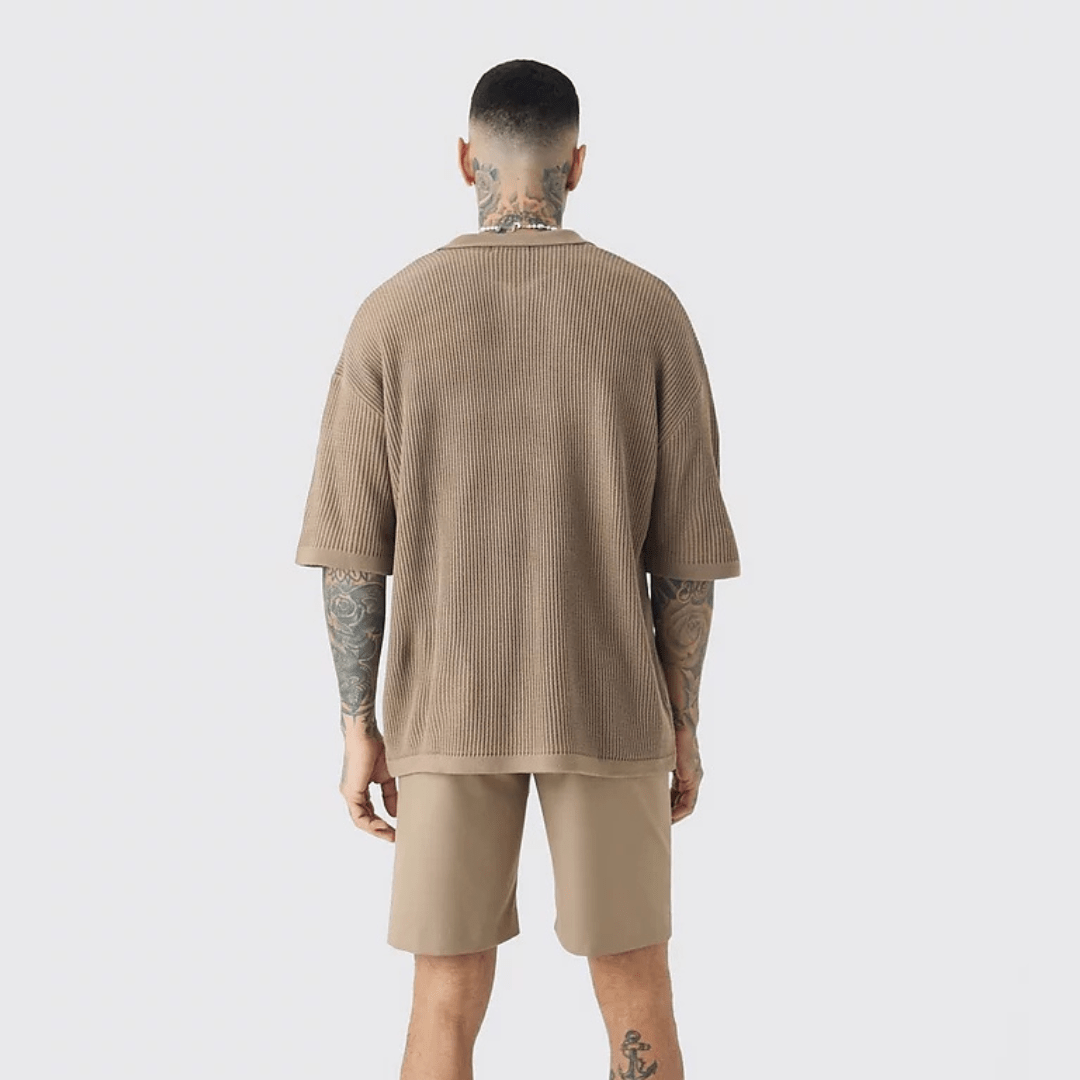 Relaxed, refined, and built for comfort. This short-sleeve knit polo features a soft waffle texture, dropped shoulders, and a deep V-collar for effortless edge.