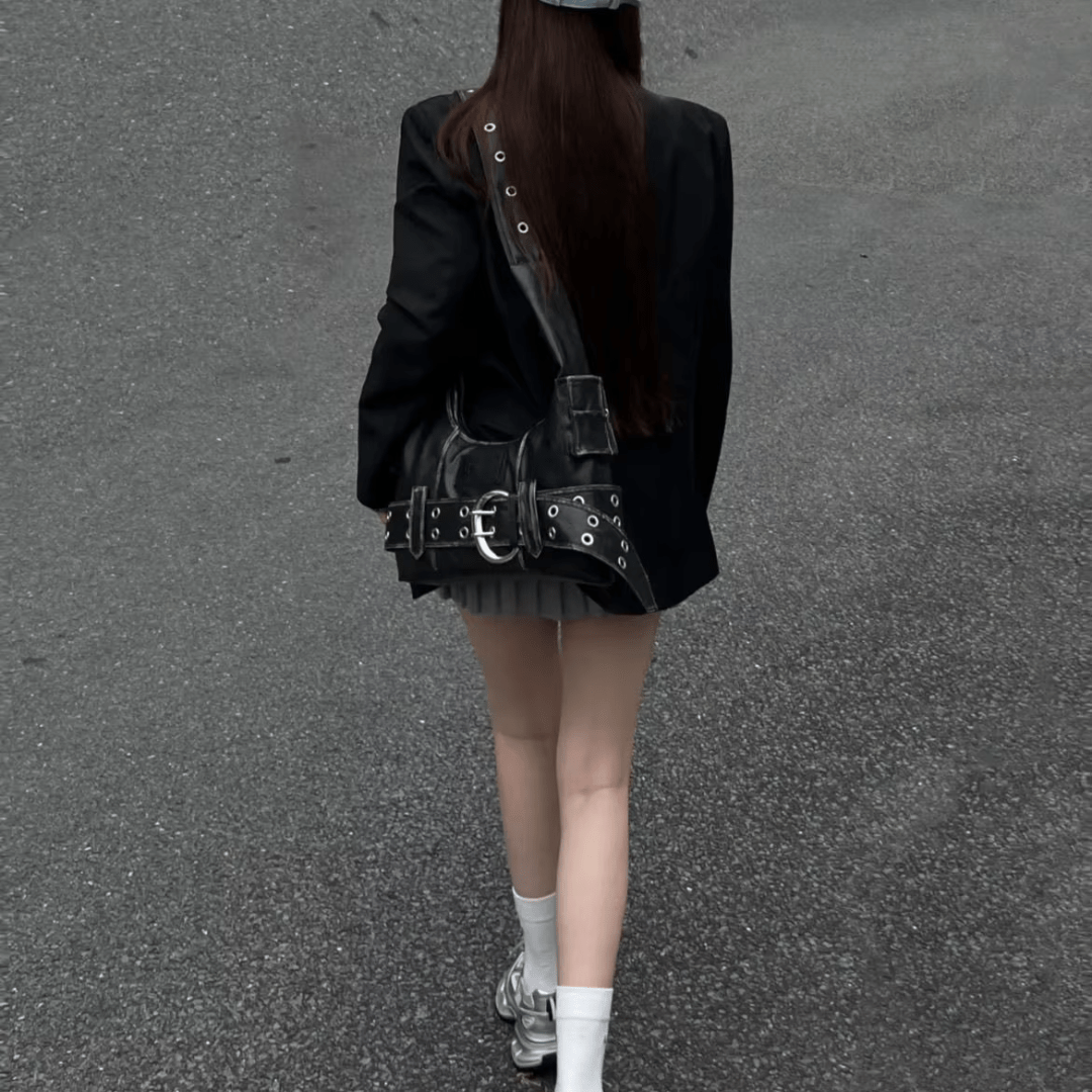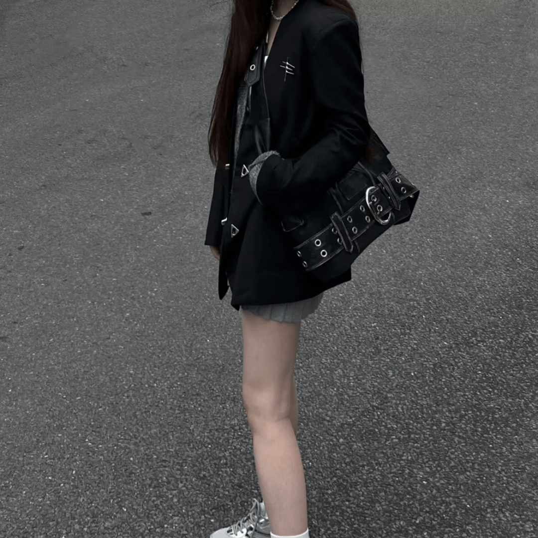 Washed in deep charcoal and frayed with intention, the Krieg Denim Shoulder Tote carries the soul of vintage rebellion with a sharp, modern edge.