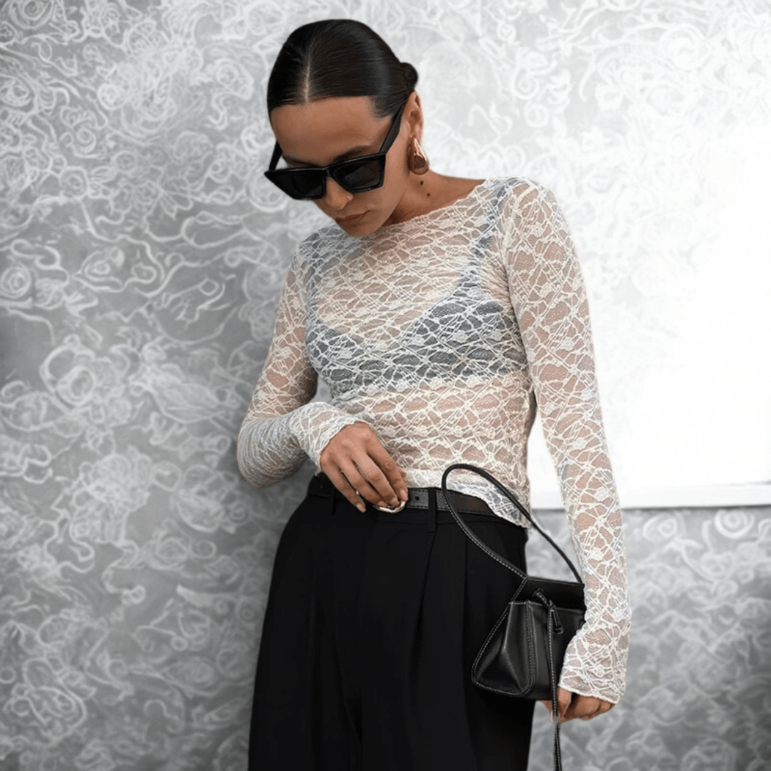 Whisper-thin and made to tease. This sheer stretch lace top features a scoop neckline, long sleeves, and a body-hugging fit that highlights your shape with subtle reveal without constraint.