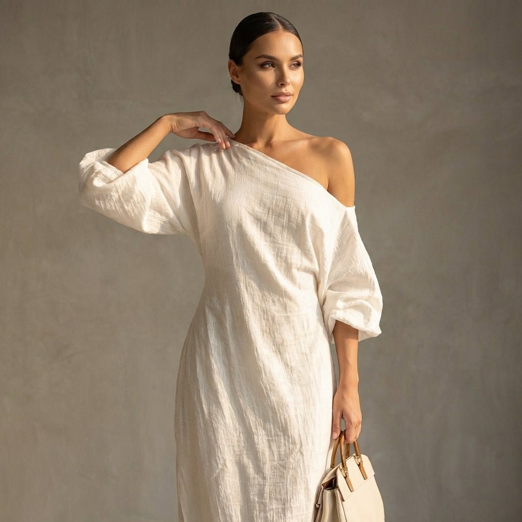 Imagine sun-drenched evenings and sophisticated resort getaways, where effortless elegance is paramount. Crafted from breathable, luxurious linen, this maxi dress drapes beautifully with a flowing silhouette that promises relaxed sophistication. Its striking asymmetric one-shoulder design is perfectly balanced by a single, billowy 3/4 sleeve, adding an artistic, modern touch. Effortlessly pair with shimmering sandals and delicate jewelry for an unforgettable summer statement.